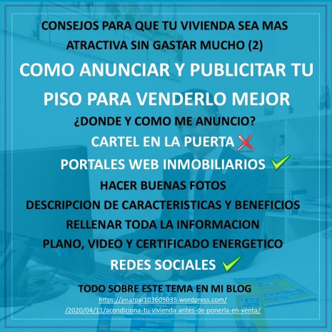 Espero que sigáis estos consejos y que os servirán para hacer una buena publicidad de vuestro piso o casa y que lleguéis a la mayor cantidad de posibles compradores. Pronto tendréis la tercera parte de esta sección de Consejos para que tu vivienda se vea más atractiva sin gastar mucho donde os hablaré de Como enseñar la vivienda.